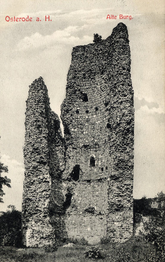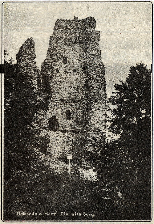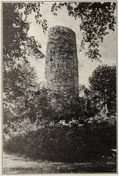 ,,Ehe ich die Landstraße einschlug, bestieg ich die Trümmer der uralten Osteroder Burg. Sie besteht nur noch aus der Hälfte eines großen, dickmaurigen, wie von Krebsschäden angefressenen Turmes".