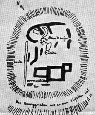 Es wird auch seitliche Gräben und Wälle gegeben haben, um einem Gegner die Annäherung zu erschweren. Mit Sicherheit war der gesamte Burgberg kahlgeschlagen, um einem Angreifer sämtliche Deckung zu nehmen.