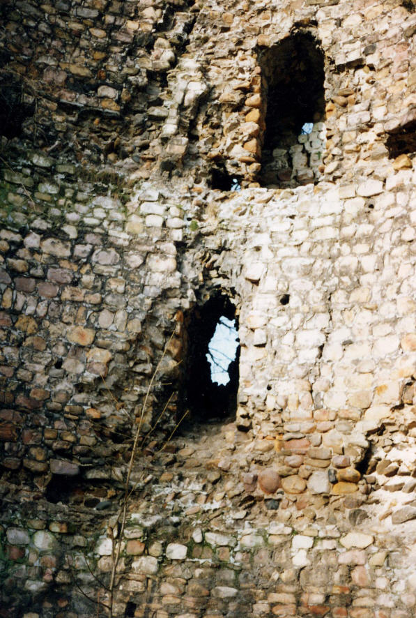Die nur durch wenige Lichtöffnungen durchbrochenen Mauern sind äußern zum Theil in rautenförmigen Verbande, innen als Füllwerk aus Flußkieseln in Gyps erbaut. Bei einer nicht zum Thurm gehörenden Mauer zeigt deren Bekleidung sogar das ährenförmige Werk (opus spicatum), so gut dieses mit ausgesuchten Flußkieseln hergestellt werden kann. Das Ganze ar mit starken Mauern und breiten (jetzt zu Gärten umgewandelten) Gräben umschlossen.