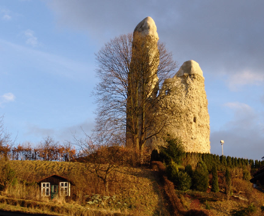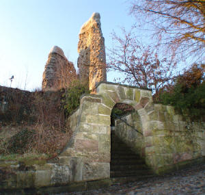 Die Ruine liegt auf einer die Stadt beherrschenden Höhe vor dem Johannistor. Außer einigen kürzlich aufgedeckten Grund- und Kellermauern, so wie einem Stück der Umfassungsmauer steht noch ein, zur Hafte jedoch abgespaltener und eingestürzter, mächtiger Thurm von runder Grundform, dessen unterer Durchmesser 16 Schritt und dessen Mauerstärke 2,337 Mtr. (8Fs) beträgt. Er hat - wie die Reihen von Vertiefungen für die Balkenköpfe zeigen — mindestens fünft Stockwerke enthalten, in dem zweiten derselben gewahrt man einen engen gewölbten Gang in der Dicke der Mauer mit zwei Stufen, welcher anscheinend zu einem Ausbau geführt hat. Der Thurm soll ehemals mit einer hohen Spitze versehen gewesen sein.