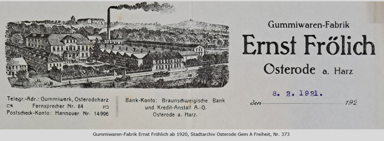 Im April 1920 übernahm Ernst Frölich aus Hann.-Münden das Werkgelände und brachte in den umgebauten und vergrößerten Räumen ein Gummi- und Regenierwerk unter. Statt Textilien wurden von jetzt an Gummiabsätze und -sohlen, technische und zahntechnische Gummiartikel im Osteroder Gummiwerk gefertigt. Sogar aus Altgummi gewann man durch Regeneration wertvolle Wertstoffe zurück. 1927 waren 150 Arbeiter und 20 Angestellte beschäftigt. Der Kaufmann Ernst Frölich hatte nicht nur die Fabrikgebäude, sondern auch ein fast herrschaftliches Wohnhaus (Nr. 113) und ein schönes Grundstück mit übernommen.