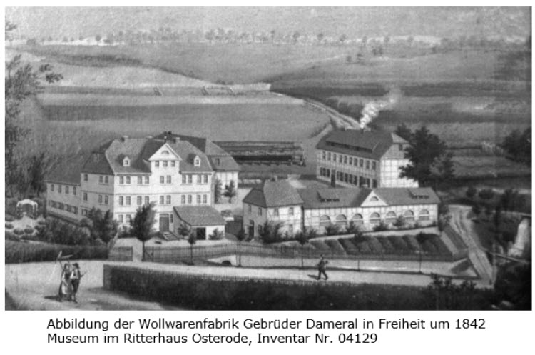 1841 kauften die Gebrüder Dameral das Gelände der Oelmühle und richteten eine Tuch- und Decken Velourfabrikation ein. 1859 kam der erste mechanische Webstuhl in Betrieb und da die Wasserkraft nicht mehr ausreichte, wurde Anfang der sechziger Jahre eine Dampfmaschine eingesetzt.
