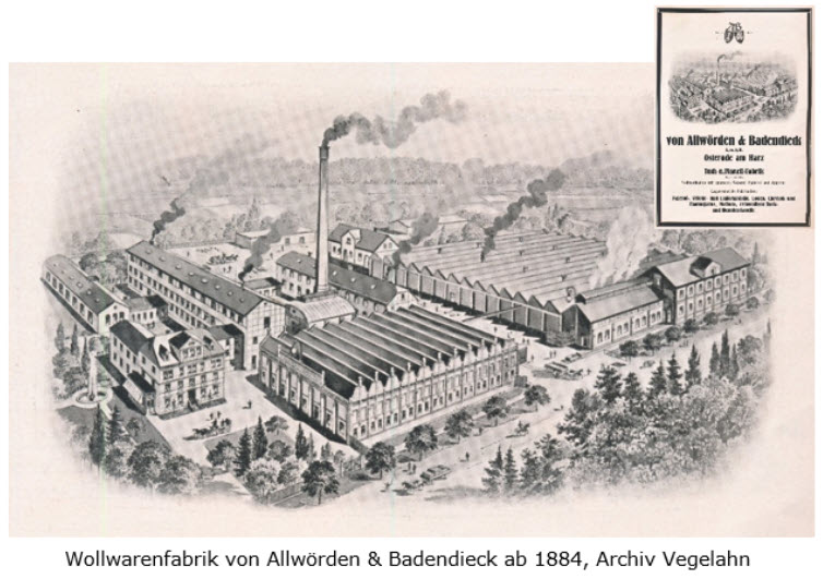 Im Jahre 1884 erwarben der aus Drochtersen stammenden Peter von Allwörden und der aus Hamburg kommenden Kaufmann Julius Badendieck das Grundstück und gründeten die Wollwarenfabrik von Allwörden & Badendieck, eines der modernsten Unternehmen der Tuch- und Zeugherstellung. Fabrikeigene Aggregate lieferten Strom. Die Maschinen wurden durch eine 120 PS-starke Dampfmaschine angetrieben. 200 Arbeiter stellten Hemden-, Rock- u.a. Flanelle, Coatings und Dessins, Kammgarnflanelle, Lamas und Friese für Möbelbezüge und viele andere Textilprodukte her, die im In- und Ausland abgesetzt werden konnten.