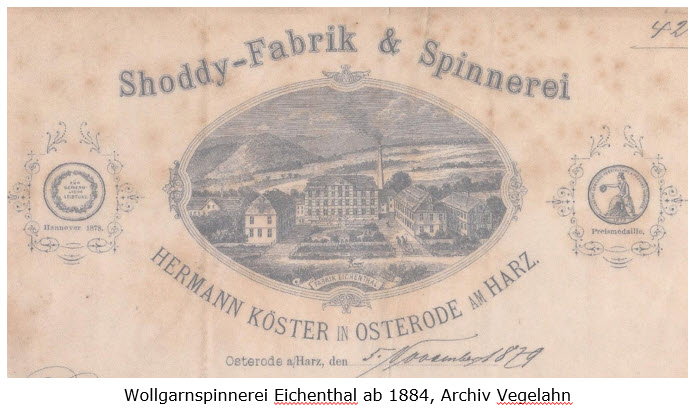 Ab 1884 gründete Hermann Köster die Wollgarnspinnerei Eichenthal. Ca. 1900 geriet die Fabrik in große wirtschaftliche Schwierigkeiten und mußte schließen.